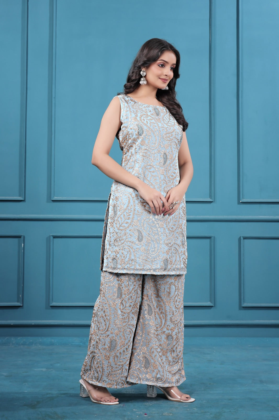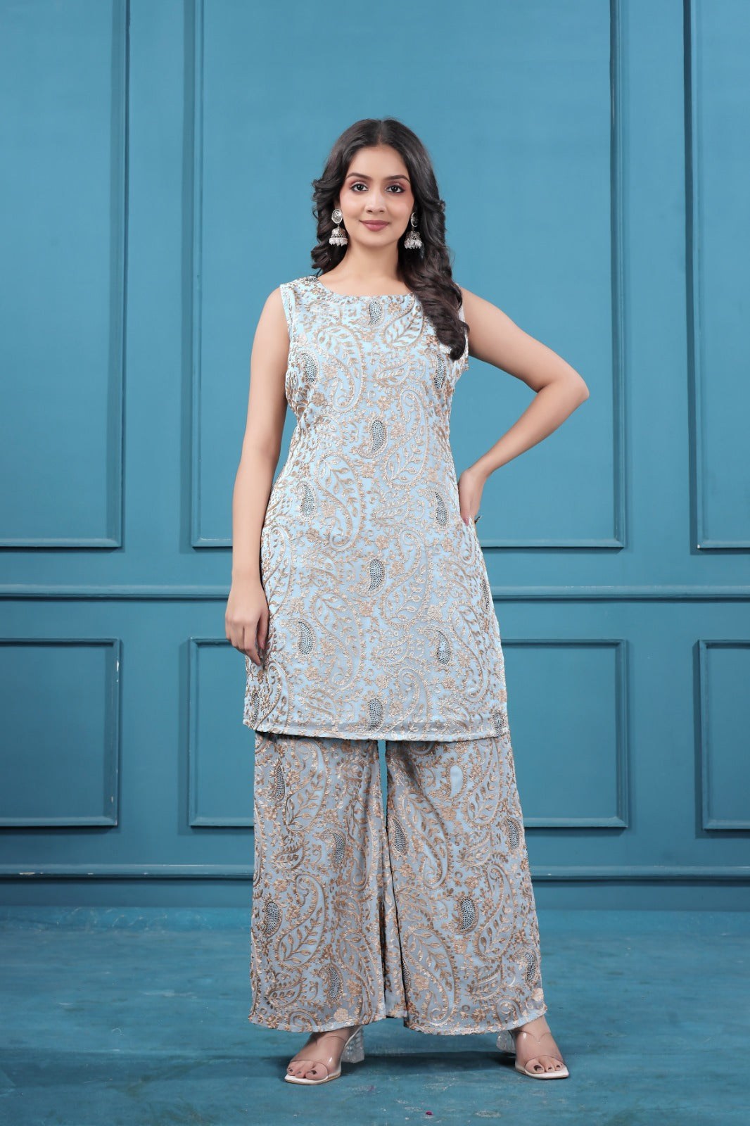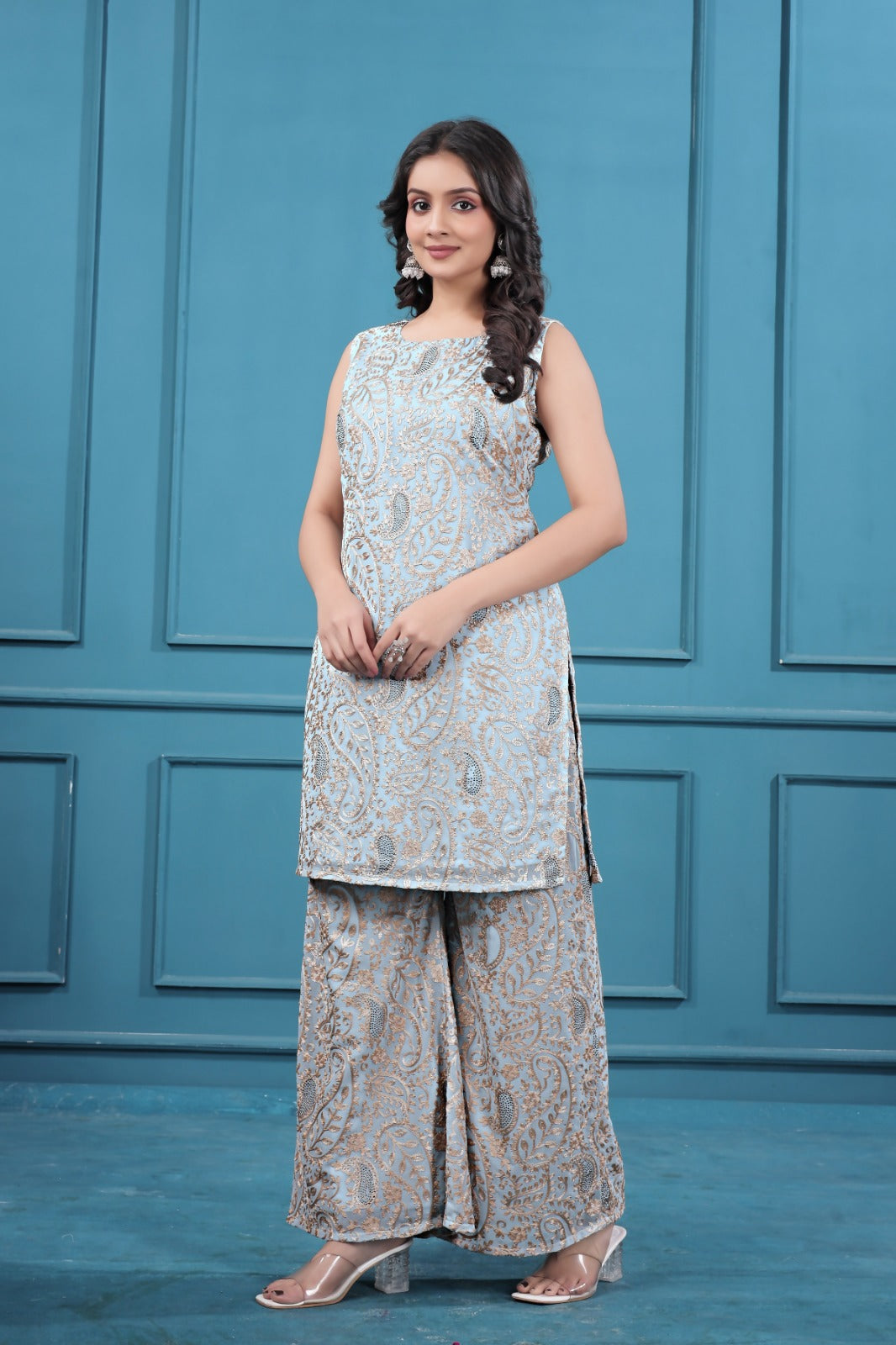 Upgrade your wardrobe with the latest Blueish Gray Georgette Embroidered Co-Ord Set in Surat from Omdev fashion. Designed with premium georgette fabric and detailed embroidery work, this stylish Women Embroidered Co-Ord Set is perfect for parties, festive celebrations, brunch outings, and special occasions.